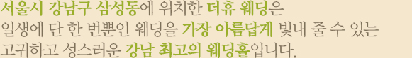 또한 웨딩 이외에 각종 연회 행사를 할 수 있는 연회홀과 전문가들의 고급스러운 음식 맛을 느낄 수 있는 뷔페가 마련되어 있습니다. 더휴 웨딩의 직원들은 최고의 서비스 마인드를 가진 숙련자들이며 고품격 고객감동 실현을 위해 항상 노력하고 있습니다. 기억에 남는 웨딩, 기억에 남는 연회가 될 수 있도록 앞으로도 최선을 다해 노력하겠습니다. 감사합니다.